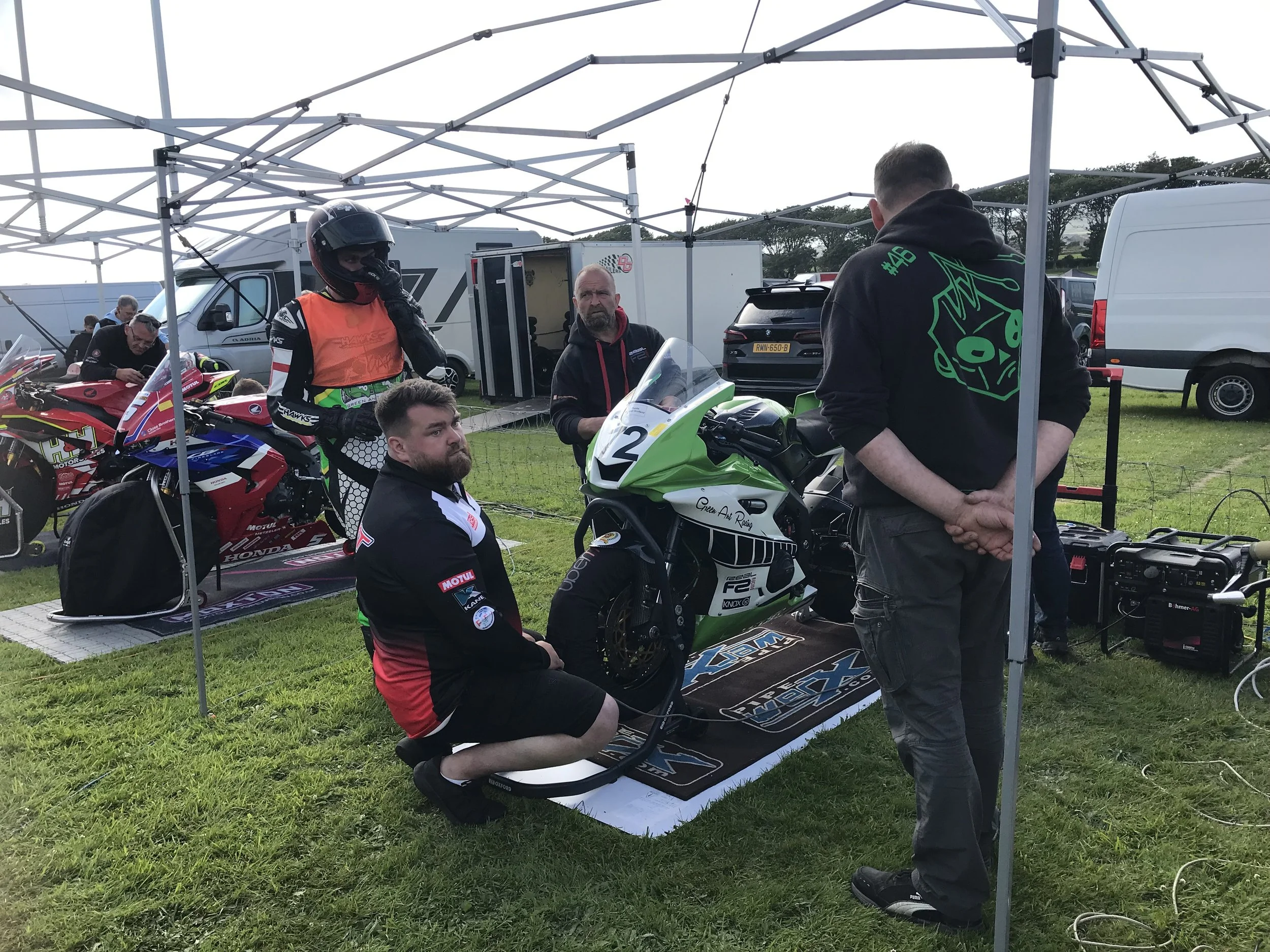 Always an exciting and anxious time but we’re looking forward to getting back to the Island! I’m not going to bore everyone too much with the day to day goings on of the team as we have so much that we get up to, getting things set up, fuel delivery, stickering up the fairing, laps of the course, data checking, tyre fitting….. the list is endless. The weather is always a worry on the Island during the TT, its makes or breaks it, and no ones in control of that! We’ve had some heavy showers which has put a spanner in the works for some of the practice sessions and the paddock suffers from water and wind damage , but with the sun drying it all up we can get out for some laps and set up ready for Race 1.